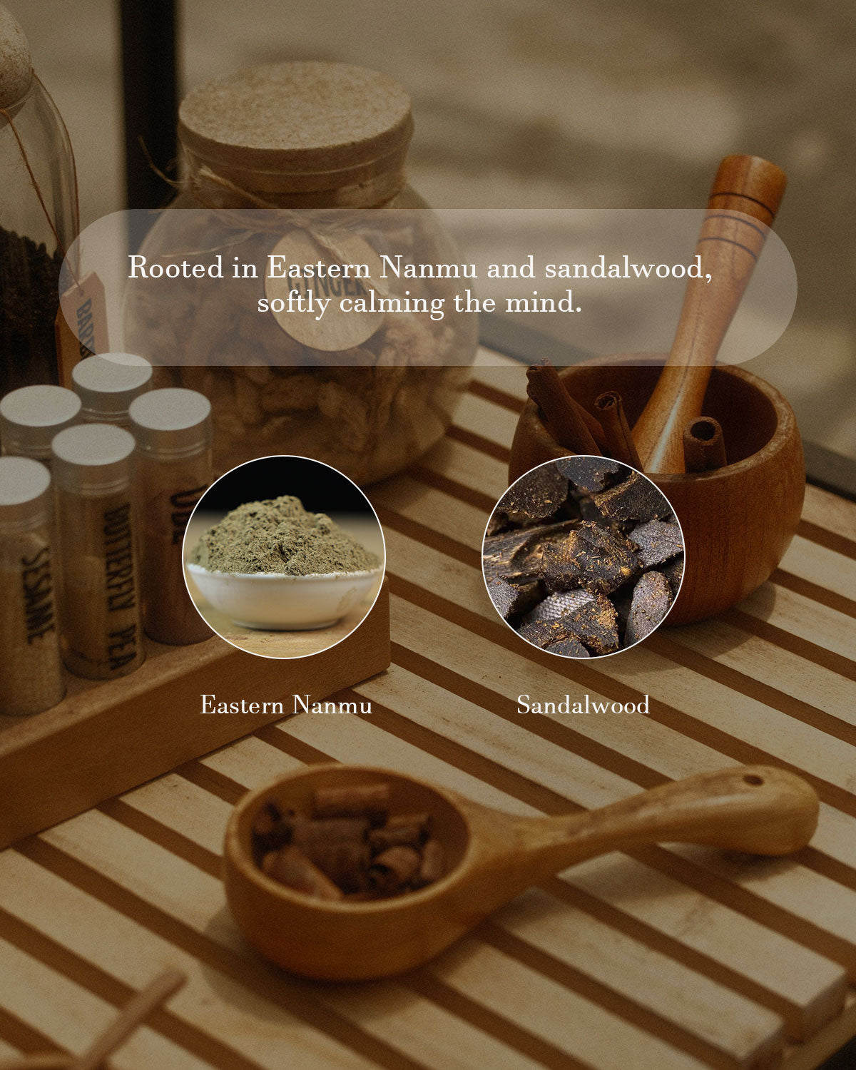 Handmade from natural wood powder, each bead is shaped and polished by hand. Infused with a fragrance blend that recalls the depth of sandalwood, it brings consistency, softness, and a lasting sense of ease.